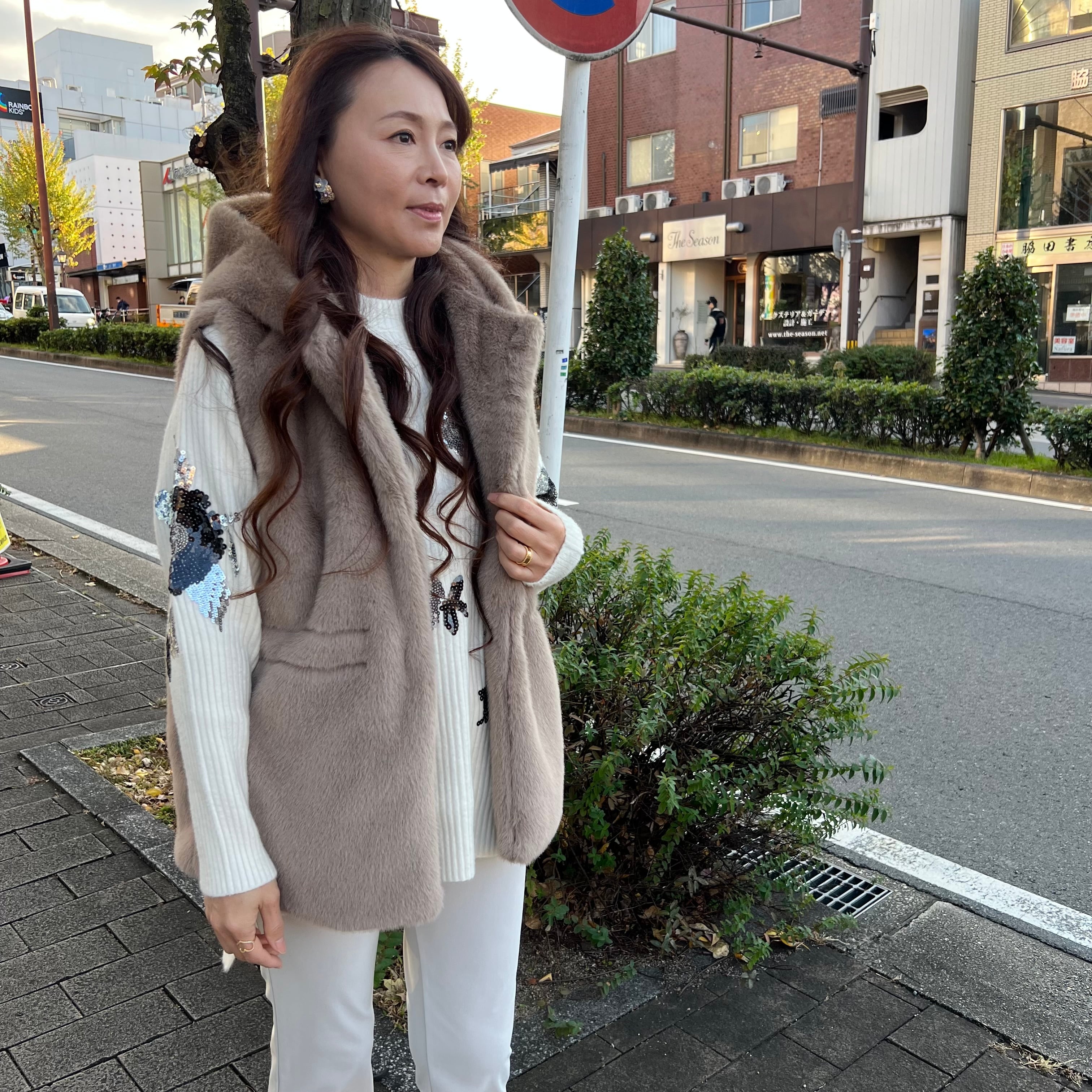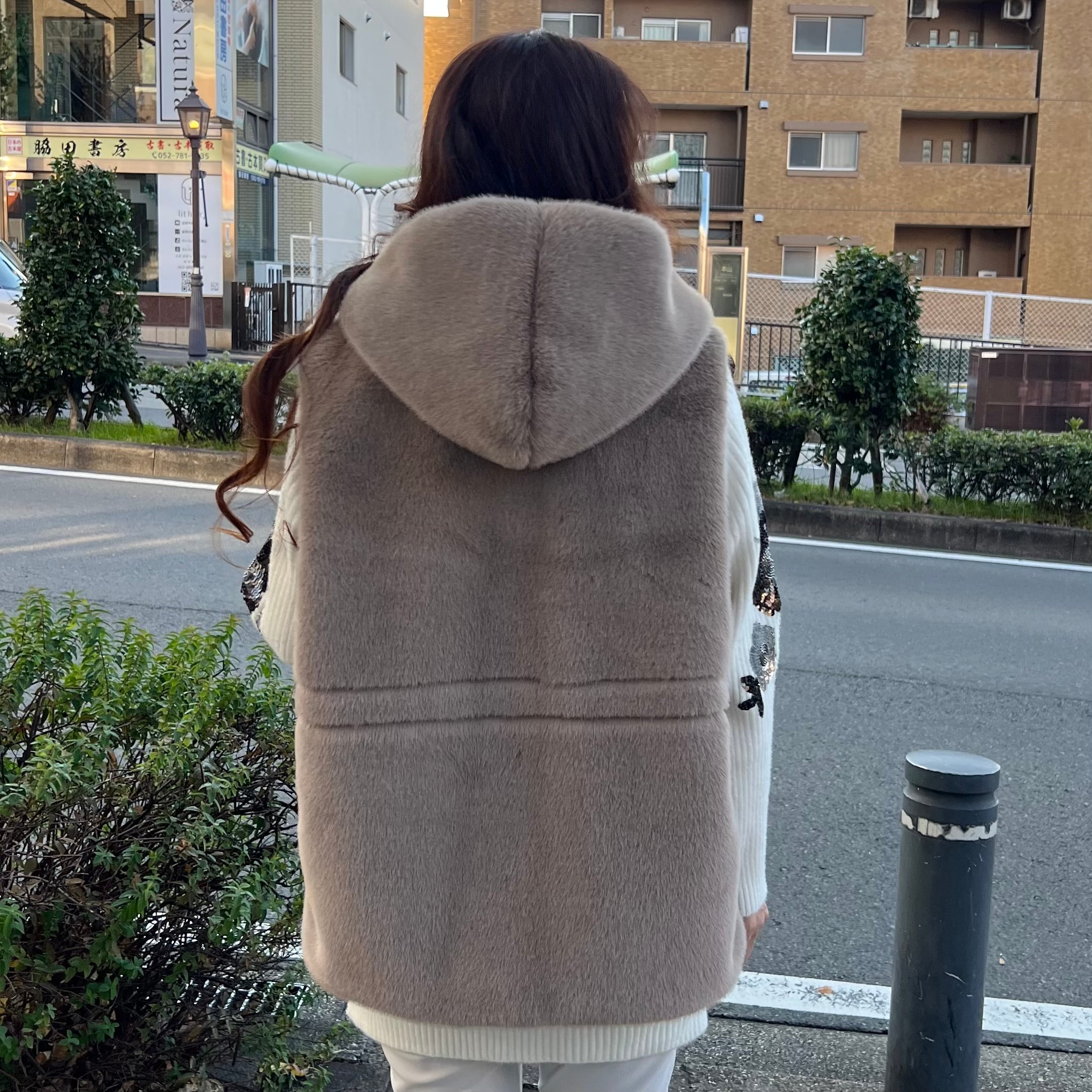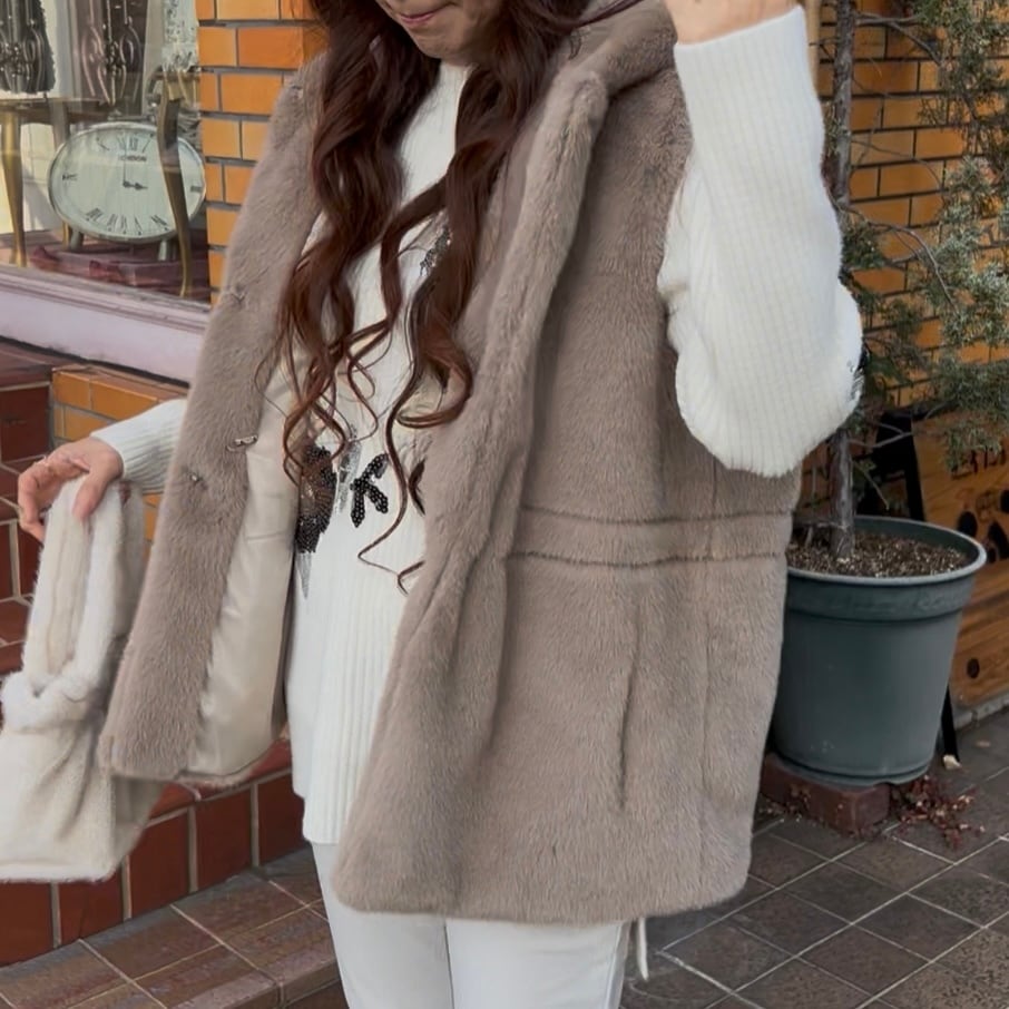 ■ココア・フード付きミディアムロング丈エコファー ベスト
