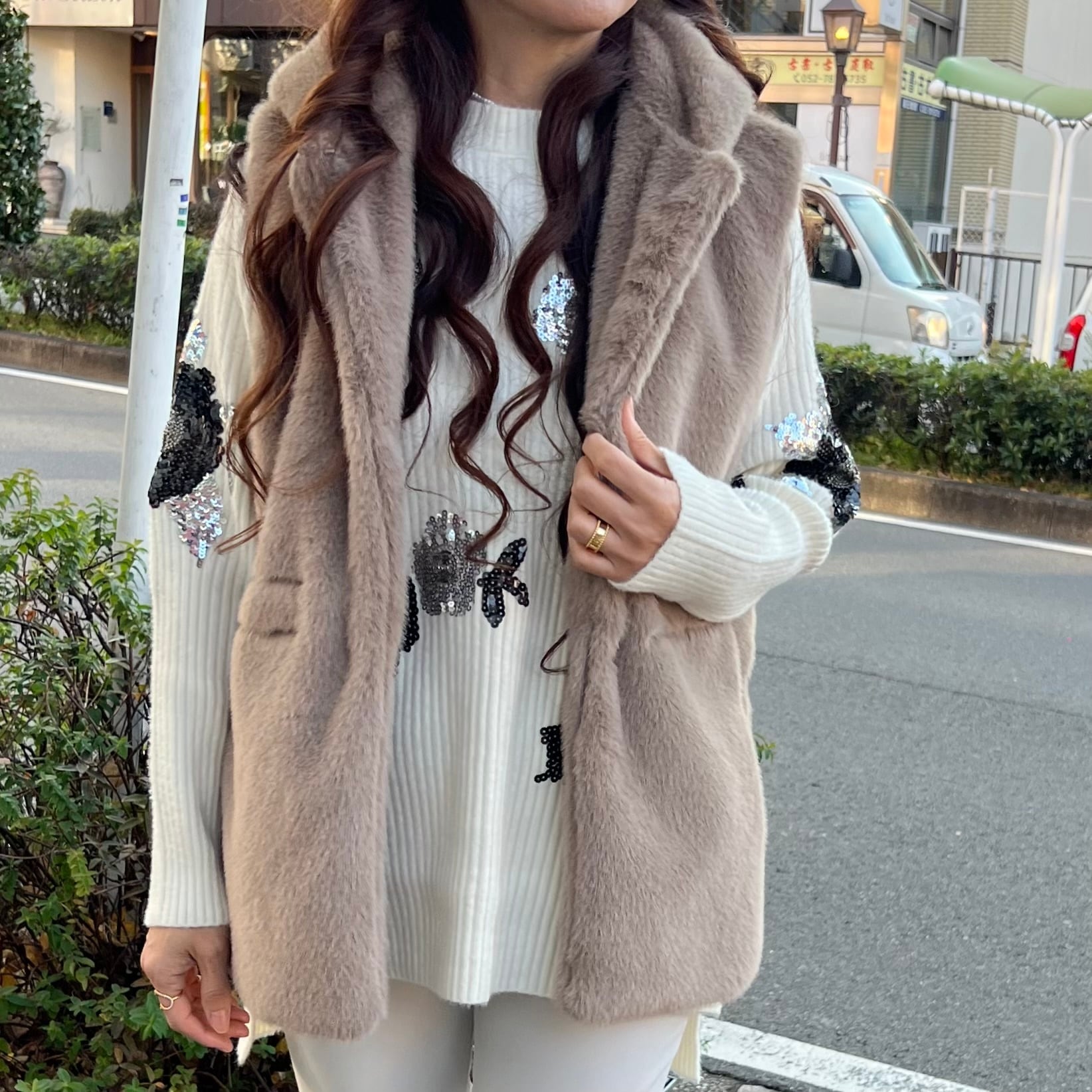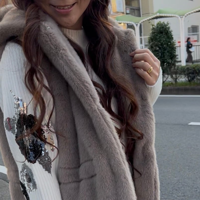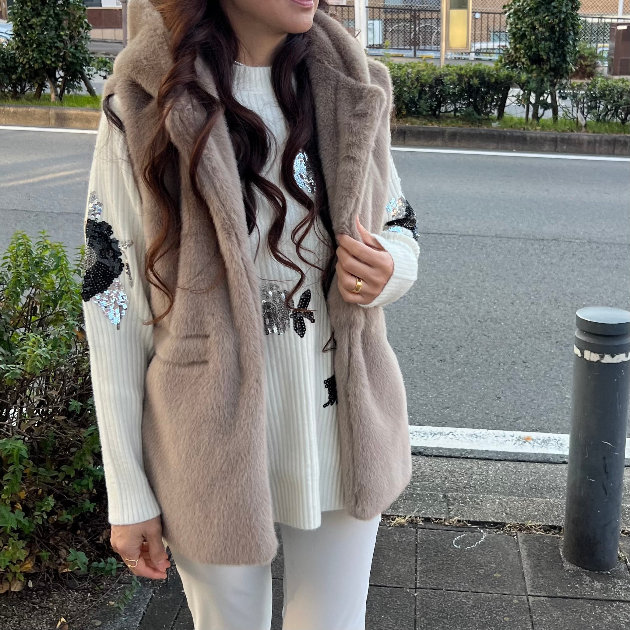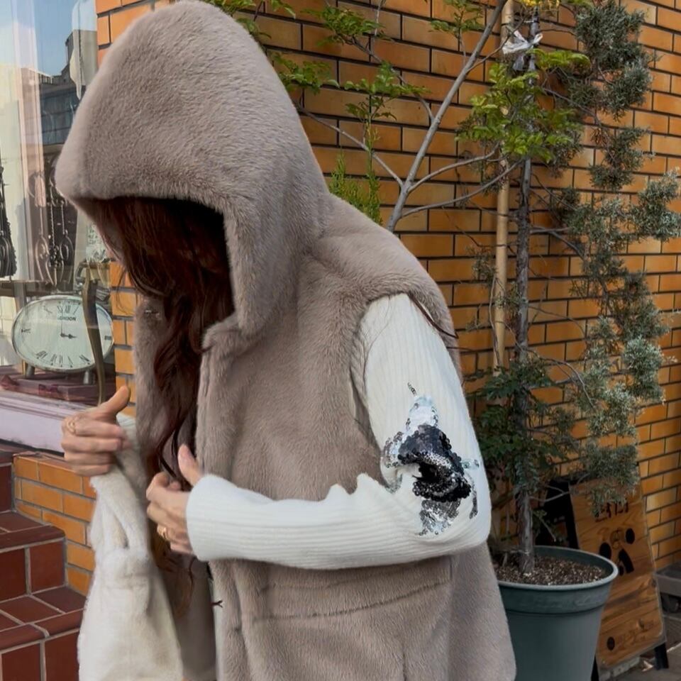 ■ココア・フード付きミディアムロング丈エコファー ベスト