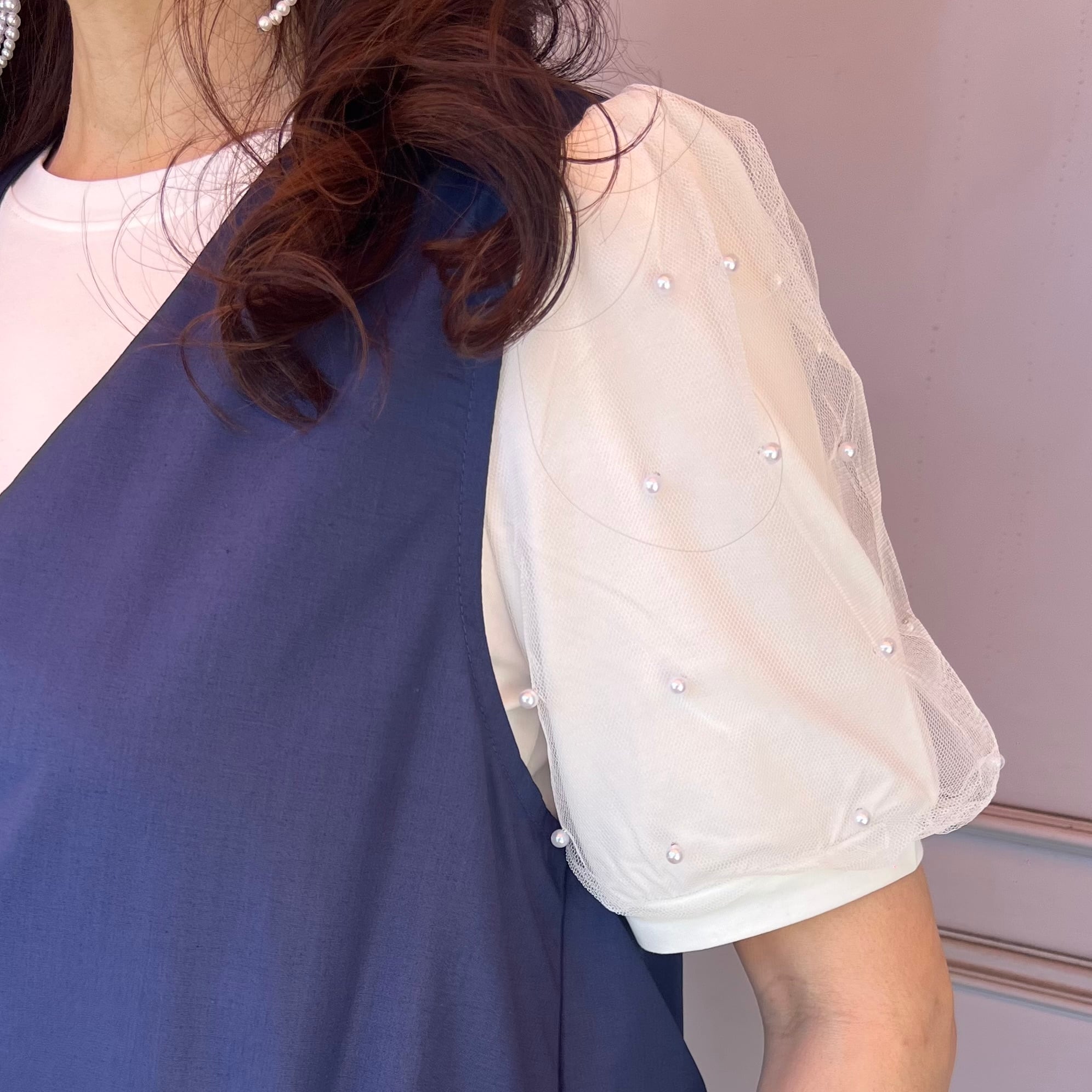 ふんわり袖のチュールに散りばめたパールが、さりげなく華やかな印象に。1枚で着ても可愛く、ワンピースのインナーとしても活躍します。さらっとした着心地で、きれいめにもデイリーにも使える万能トップスです。