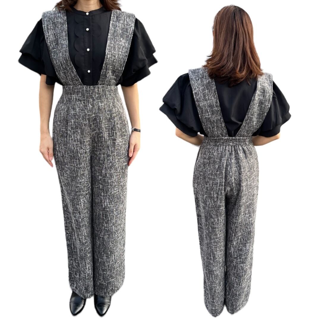 【パンツ】肩ストラップ取り外し可能ツイードサロペット
